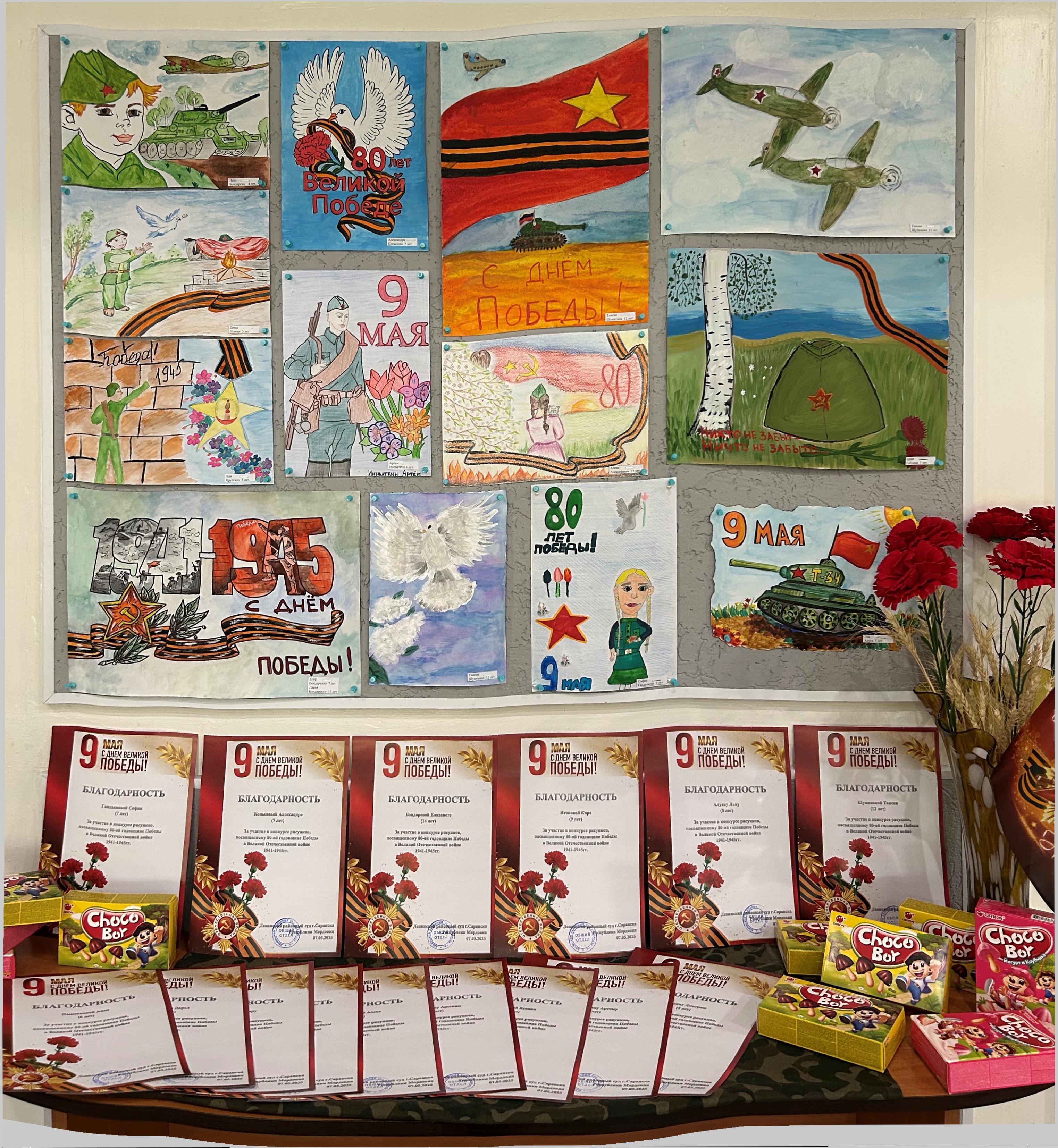 В Ленинском районном суде г.Саранска состоялось подведение итогов конкурса детского творчества на тему «80 лет подвигу: глазами новых поколений», посвященного 80-летию Победы в Великой Отечественной войне 1941-1945 гг. В конкурсе принимали участие дети судей и работников аппарата суда разных возрастов: Анна Крутских 5 лет, Дима Шакин 5 лет, Александра Копылова 7 лет, Лев Алуев 5 лет, Лиза Бондарева 14 лет, Кира Игонова 9 лет, Артем Иневаткин 6 лет, Анна Пыненкова 6 лет, Алена Алексейкина 13 лет, Ксения Горбунова 5 лет, Арсений Салтанкин 7 лет, Дарья Бондаренко 15 лет, Егор Бондаренко 7 лет, Таисия Шунихина 12 лет, София Гандымова 7 лет. Проведение конкурсов на тему Великой Отечественной войны 1941-1945 годов способствует осмыслению подрастающим поколением исторических событий той страшной войны, унесшей миллионы жизней взрослых и детей, сохранению у них памяти о подвигах наших предков, которые не жалея своих жизней, защитили наше Отечество, формированию у детей патриотических ценностей и гордости за Великую Победу. Всем участникам детского творчества от имени коллектива суда вручены благодарности и сладкие призы. ![]() |
